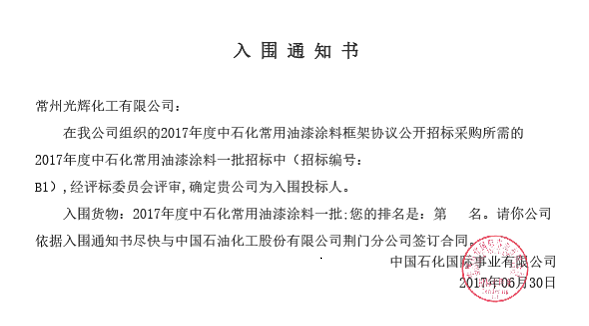 - 2017-08-09 > 光輝化工入圍中石化油漆涂料供應(yīng)商名單